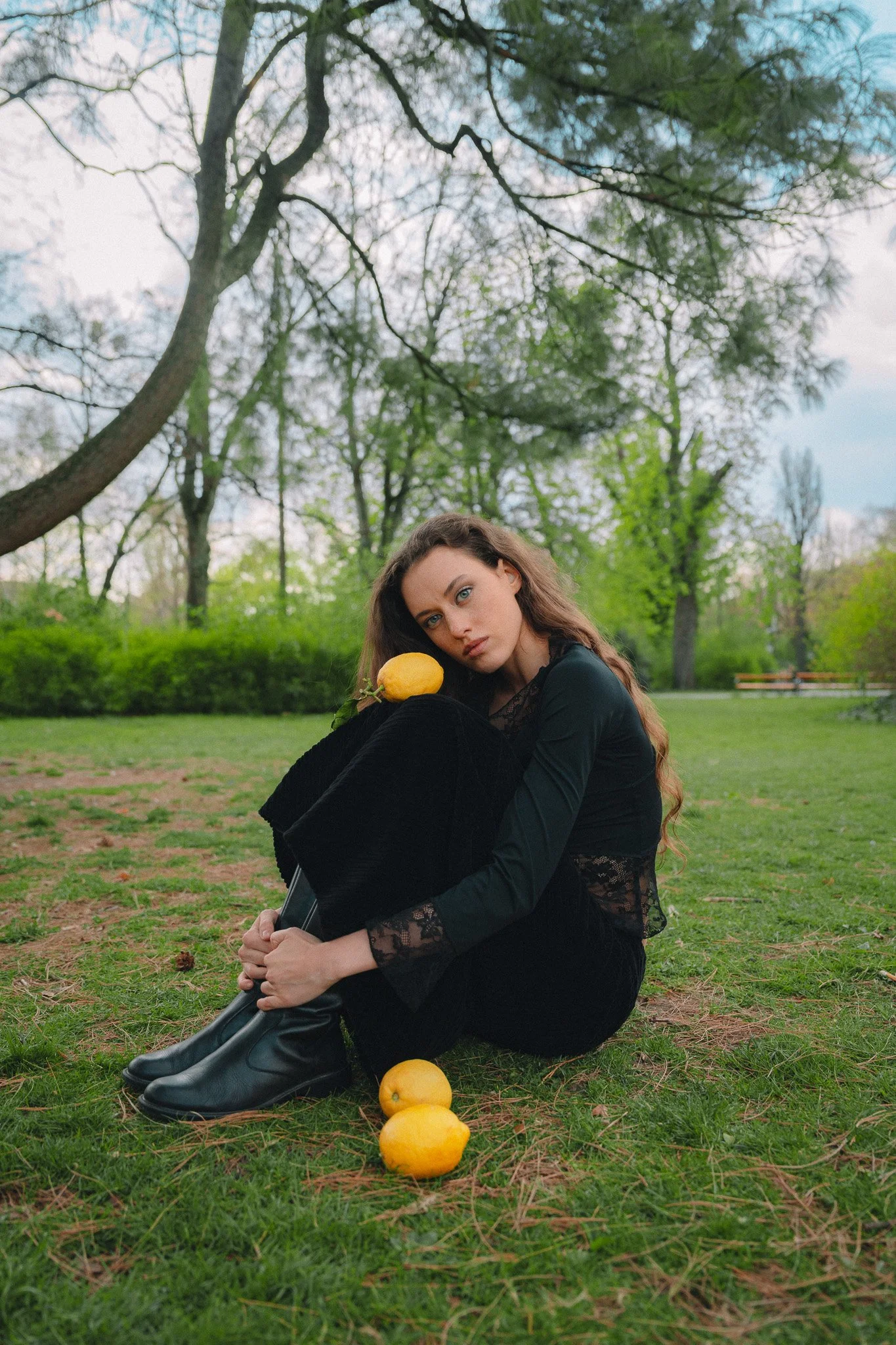 A woman in black clothing with lace sleeves sitting on grass in a park, surrounded by yellow apples and trees with green leaves, looking at the camera.