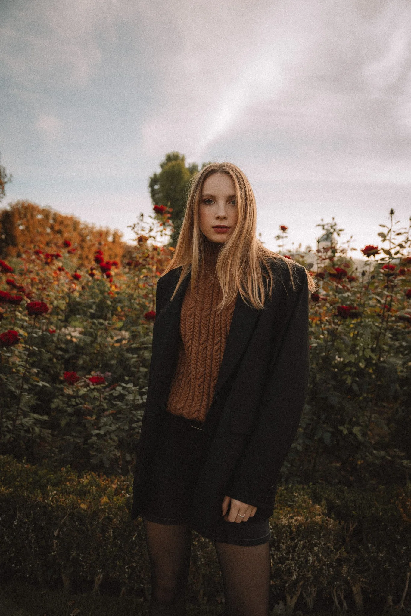 A young woman with long, blonde hair wearing a brown sweater, black blazer, and black tights, standing outdoors in front of a garden with red flowers under a cloudy sky.