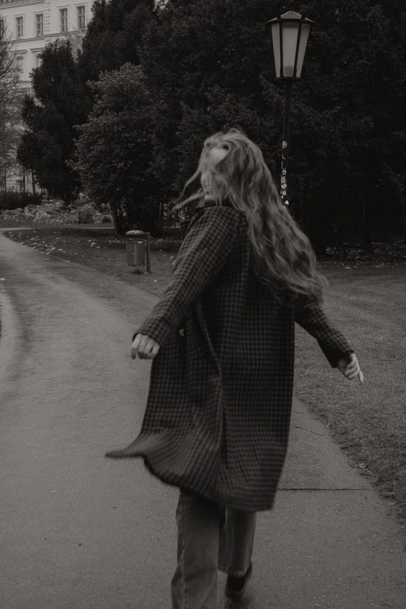 A woman with long wavy hair walking on a paved path in a park, wearing a checked coat and jeans, with trees and a lamp post in the background.