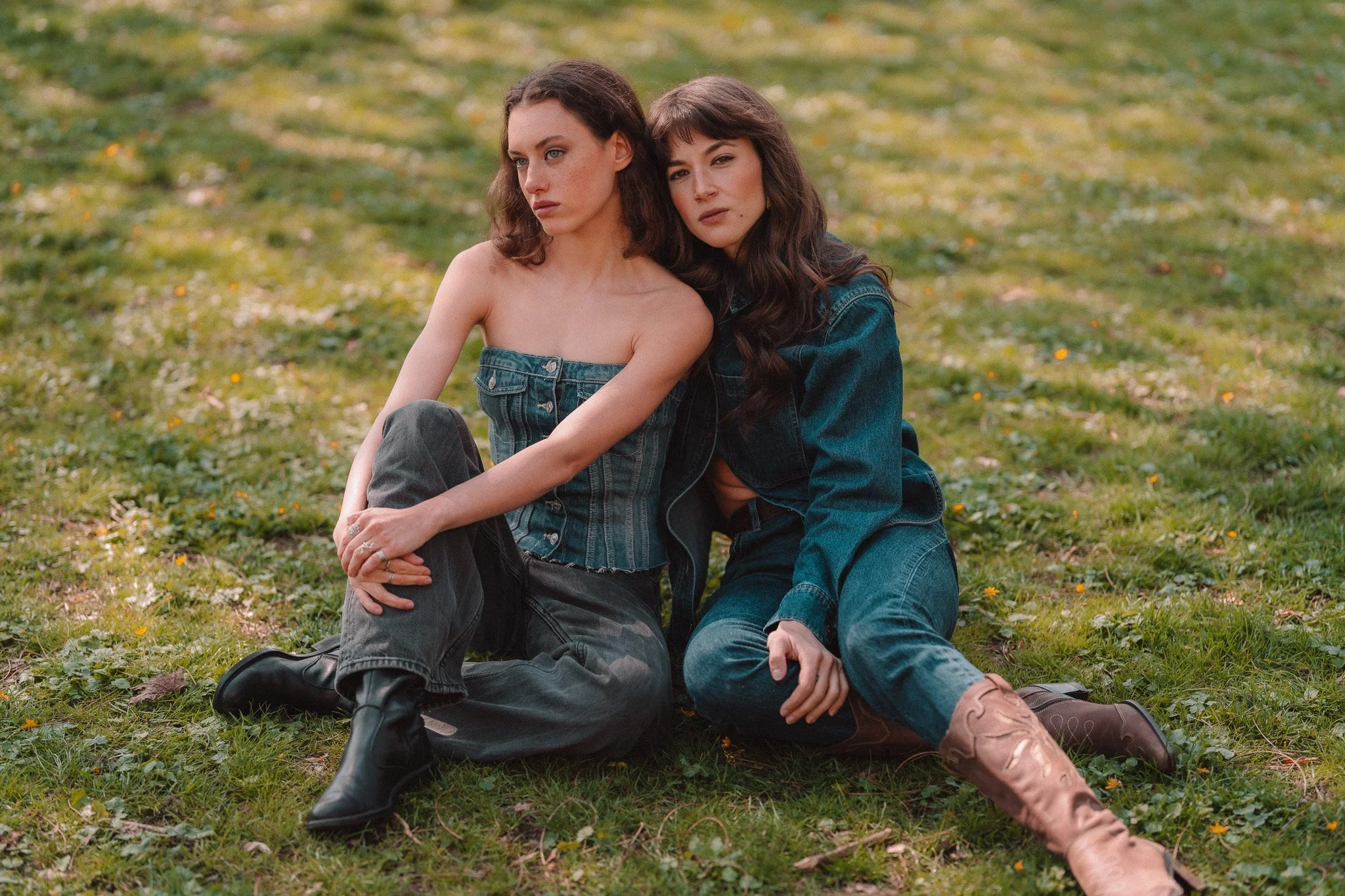 Two women sitting on a grassy field, dressed in denim outfits, with one in black boots and the other in boots with buckles, looking serious and close to each other.