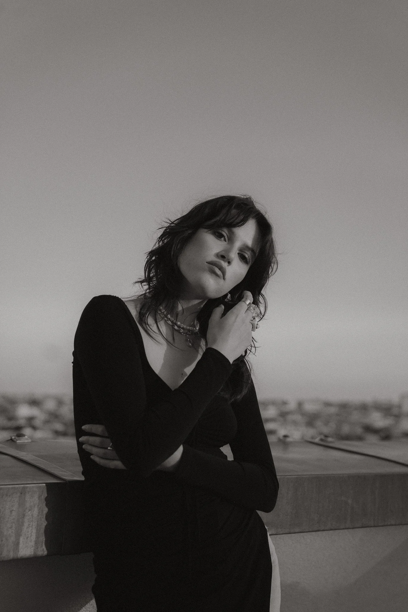 A woman with curly hair sitting on a stone ledge on a rooftop, wearing a black top, beige pants, and high heels, with a cityscape background in black and white.